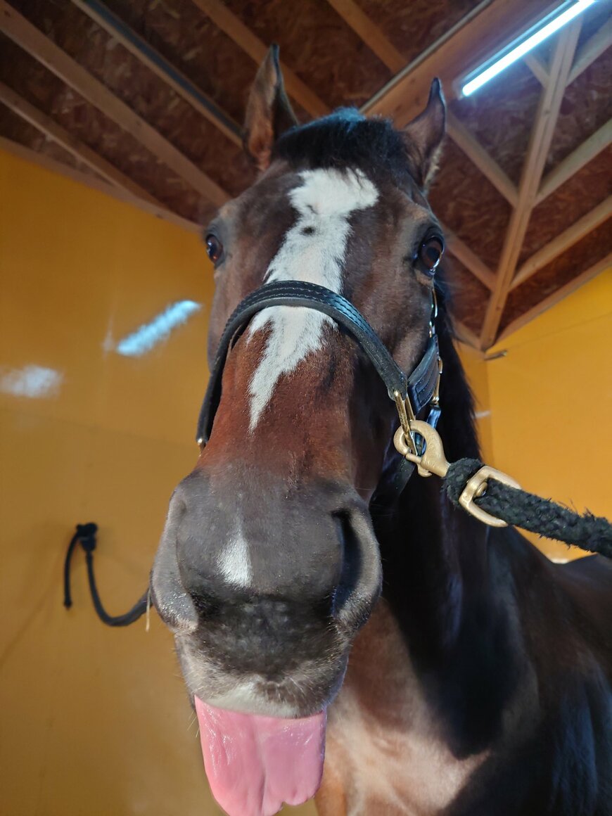 そこに収められているのは、舌を出しながらカメラにクリクリとした目を向ける障害の絶対王者・オジュウチョウサンの姿でした。