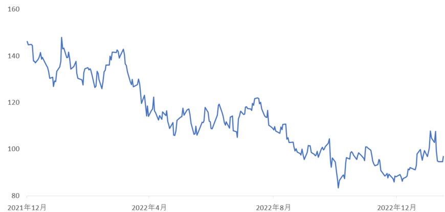 特に年初来高値である2022年2月2日の148ドルから年初来安値である同年11月3日の83.43ドルまで、約-44%の大幅下落となりました(いずれも終値ベース)。