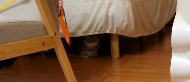 「行きたくないよ……」ベッドの下に隠れるさぶろーくん……!