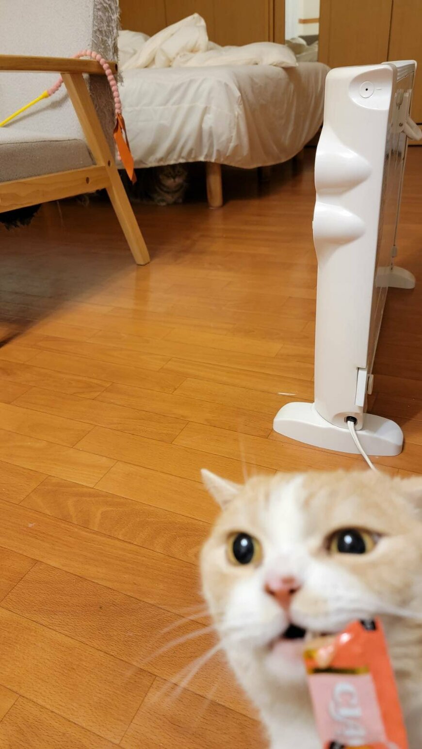 2枚目の写真をよく見ると、「行きたくない……」と言わんばかりにベッドの下に隠れるさぶろーくんの姿がありました。手前には、ちゅ~るを食べるししまるくんも写っていますね。