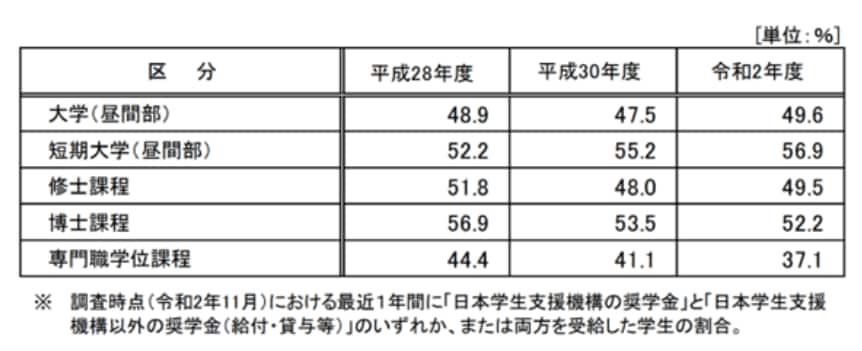 日本学生支援機構「令和2年度 学生生活調査結果」によると、大学生の約半数が奨学金を借りています。