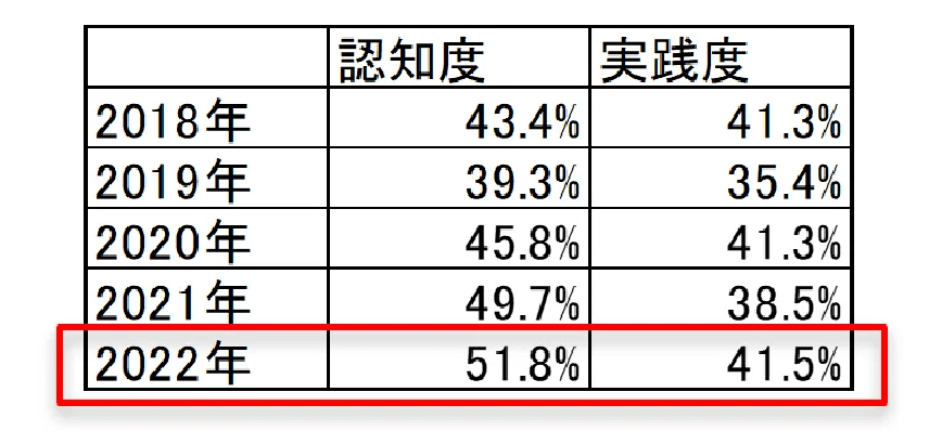 富士山の銘水株式会社の行ったローリングストック法に関する調査では、2018年と比較すると2022年のほうが認知度・実践度ともに上がっていることが分かります。
