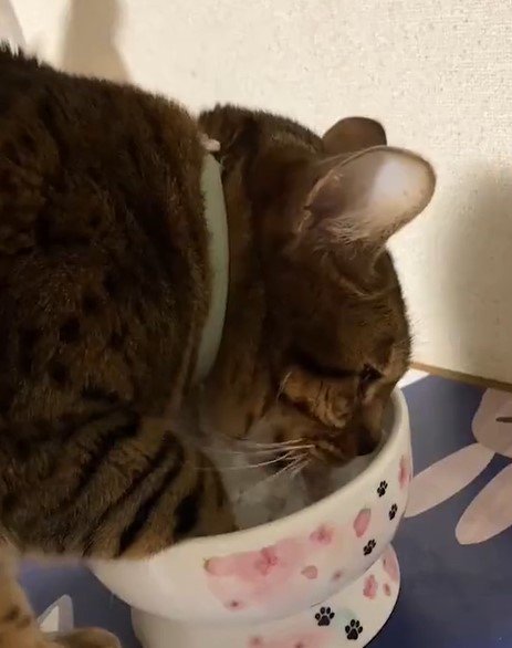 なぜか容器に手を入れ込んだまま、水分補給に勤しむ猫さんにホッコリ