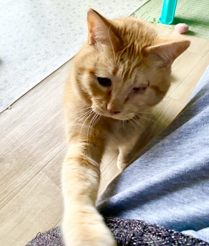 写っているのは、モフモフの茶トラ柄をした毛並みが印象的な「モカ」くん。モカくんは保護猫さんで、子猫の頃に公園でひとりきりで野鳥と戦い、片目を失う大怪我を負ってしまったそうです。モカくんは保護されたのち、飼い主さんや同居猫ちゃんたちの家族の一員になりました。