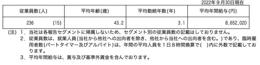 FOOD&LIFE COMPANIES(提出会社)の2022年9月末時点での従業員数、平均年齢、平均勤続年数および平均年間給与は以下の通りです。