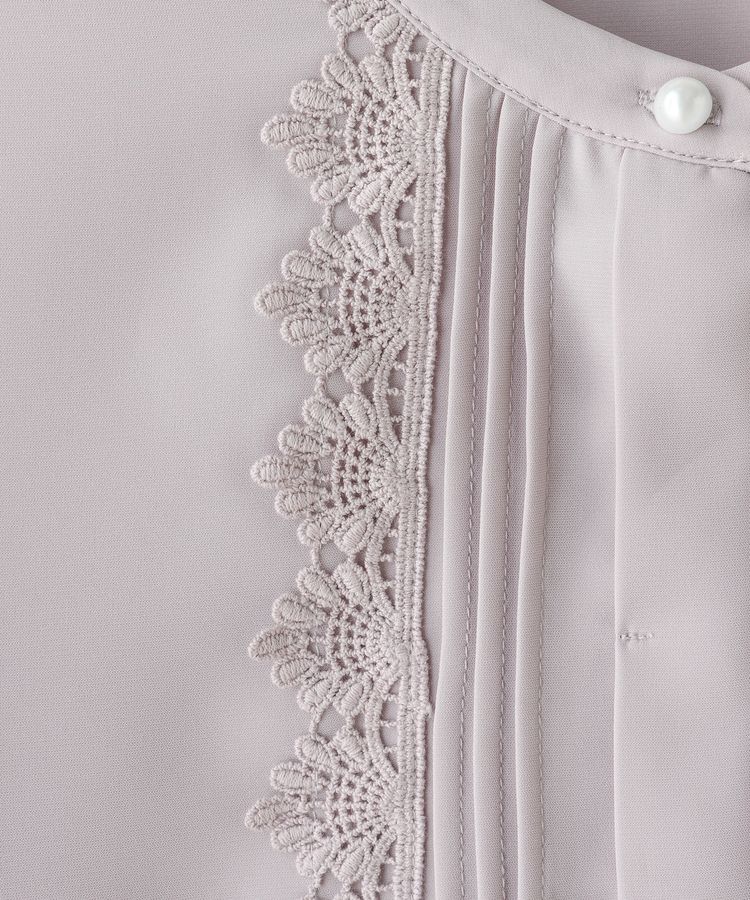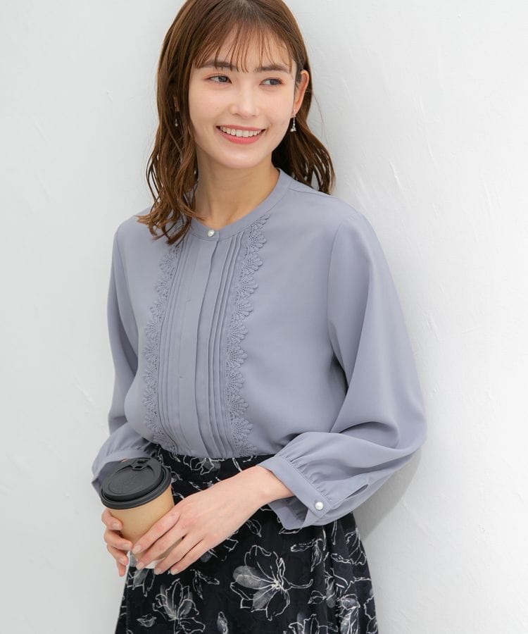 人気のピンタックブラウスに、レースがプラスされた華やかなアイテムです。フロントボタンを隠した「比翼仕立て」なのも素敵です。