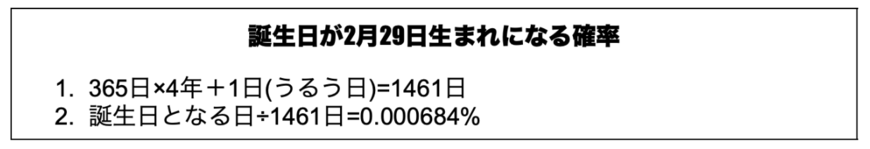 本来であれば、「誕生日となる日÷365日」であり、その確率は0.2739%であるため、2月29日が誕生日となる確率は非常に低いといえます。