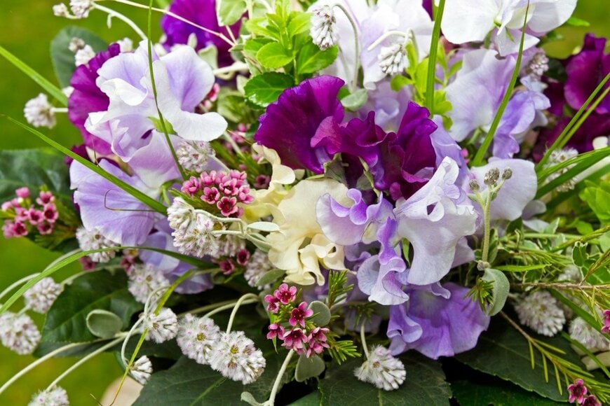 ピンクが定番ですが、パープルを選ぶと大人っぽい雰囲気に。スイートピーの淡い色合いは、他の植物を邪魔することなく引き立てます。