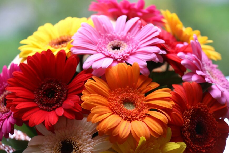華やかな雰囲気のキク科のガーベラは、春のブーケやアレンジメントに加えたい花。イエローやオレンジ、ピンクの花弁はマットな色合いで目を引きます。