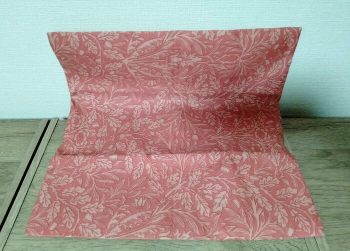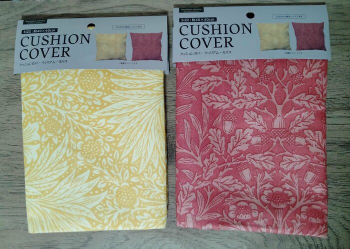 セリアでウィリアム・モリスデザインのクッションカバーが販売されているのを発見しました。売り場では、写真のように折り畳んで販売されています。