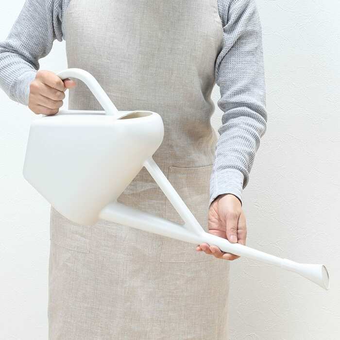 立てて置けるよう形状に工夫が施されたジョウロ。ベランダなどの限られた場所でも、立てることでコンパクトに収納することができます。ホワイトの色味とシンプルなデザインで、収納時に周囲の雰囲気を損なわないのも嬉しいポイント。