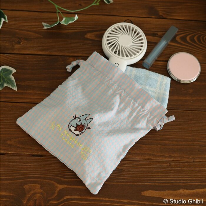 「となりのトトロ 巾着ポーチ」は、柔らかな水色とピンクのチェック柄の生地に刺繍の入ったポーチです。縦・横ともに20cmはあるので、トートやリュックのバッグインバッグや、小物をしまうためのケースなどとして便利に使えます。