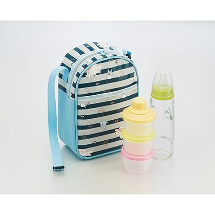 ほ乳瓶と粉ミルクケースを収納できるファスナー式のポーチです。仕切りなどはついていないので、離乳食が始まってからはマグとおやつを収納することもできます。内側にはメッシュポケットがついているので、スプーンや手拭きなどをしまうのに便利です。