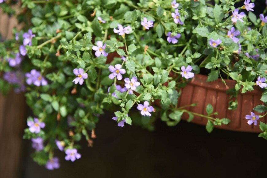 バコパはほふくして広がり、一面に散りばめられたように咲く小花が可憐。花色は白のほかにブルーやピンクも。鉢の手前に植えると縁から垂れ下がるように咲く姿が楽しめます。※参考価格:200~300円前後(3号ポット苗)