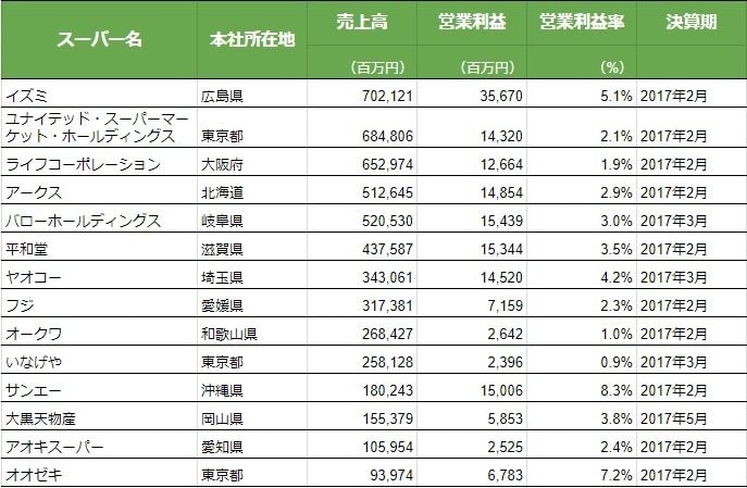 下図は、地方の有力なスーパーをリストしたものです。直近の決算(2017年2月期や3月期)から売上高と営業利益、営業利益率を示しています。