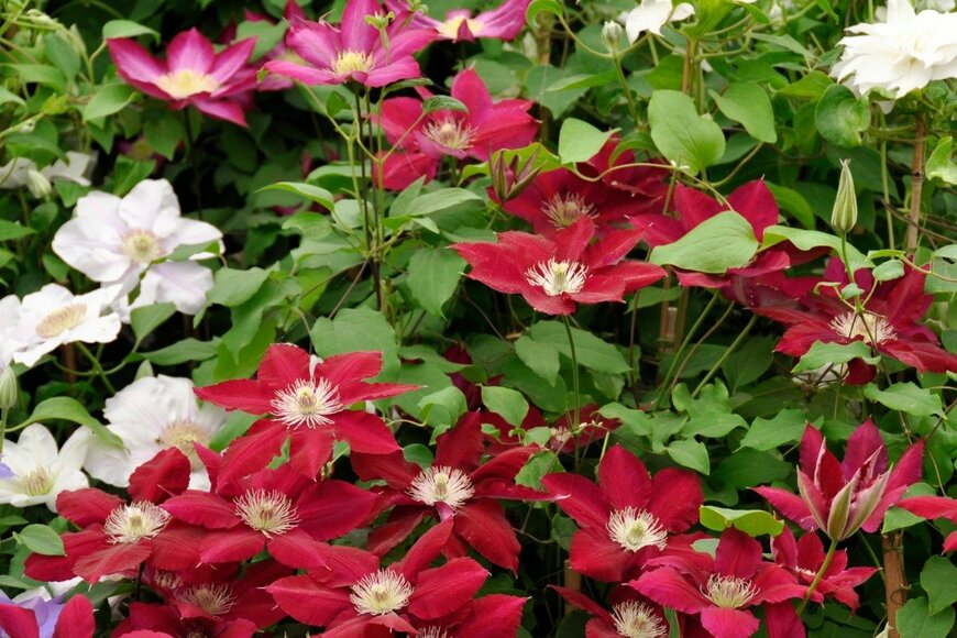 美しい花を咲かせるクレマチスは一年中楽しむことができる多年草。開花時期が異なる品種をうまく組み合わせると、花の絶えない庭に仕上がります。