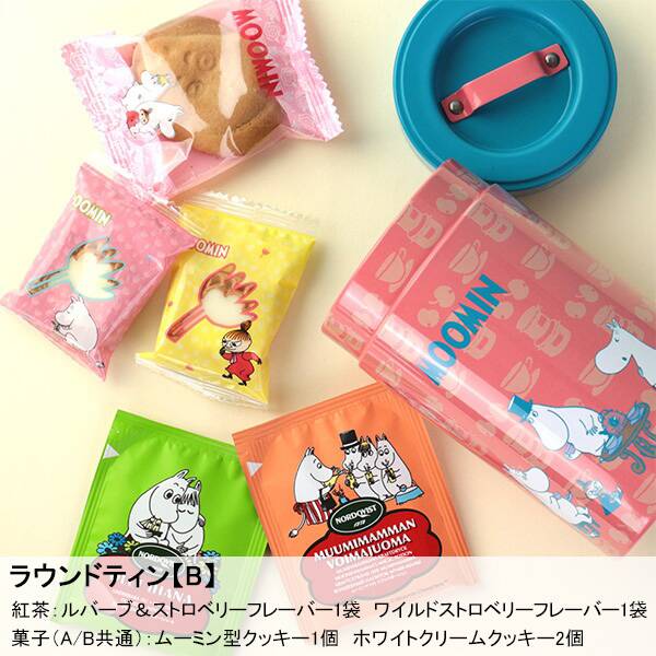 ムーミンのデザインがかわいいハンドル付きのラウンドティンです。中には焼菓子とフレーバーティーが入っています。フレーバーティーの内容は、レモンフレーバーとブルーベリーマフィンフレーバー、またはワイルドストロベリーフレーバーとルバーブ&ストロベリーフレーバーの2パターンです。オンラインストアではいずれかひとつが届きます。
