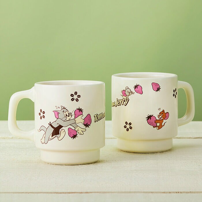 2個重ねると、コミカルなシーンが浮かび上がるマグカップです。苺を運ぼうとしている「トム」と、こぼれてきた苺を「ジェリー」と「タフィー」が取ろうとしている、楽しく賑やかな様子が描かれています。