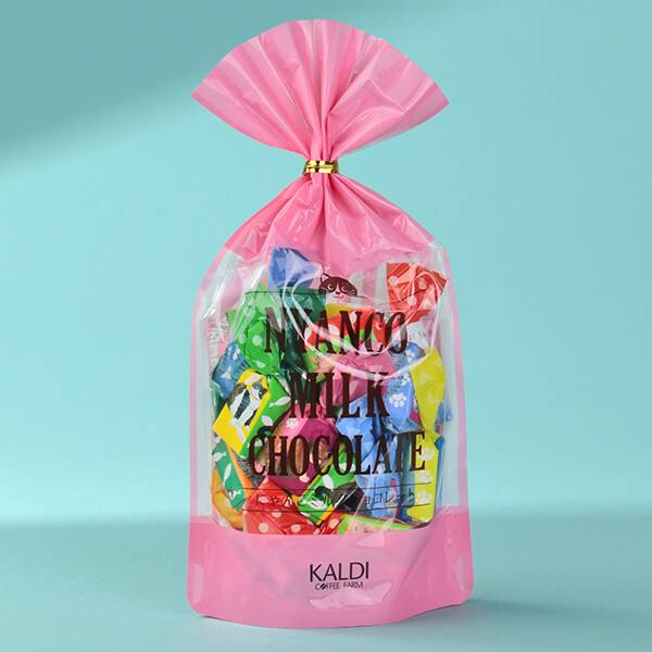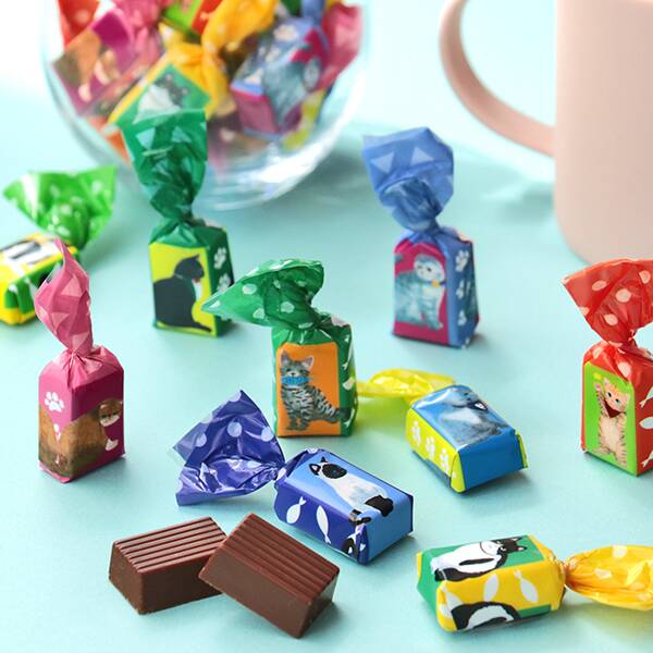 「にゃんこミルクチョコレート」は、猫の絵の描かれたパッケージに包まれた、個包装のチョコのお菓子です。8種類ほどの絵柄がランダムな取り合わせで入っています。
