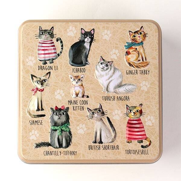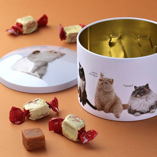 複数の種類の猫のイラストが丸い缶の上と側面に描かれた缶入りのキャンディです。オンラインストア限定販売品で、実店舗では入手することができません。
