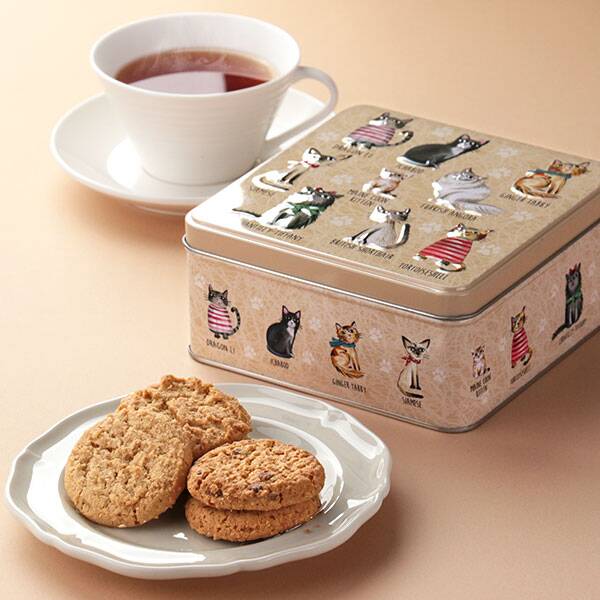 四角い缶に、「チョコチップ&オレンジ」「ステムジンジャー&レモン」の2つの味のクッキーが入っています。イギリスの伝統的なレシピのクッキーです。イギリスで見かける猫のイラストがティータイムを盛り上げてくれますよ。