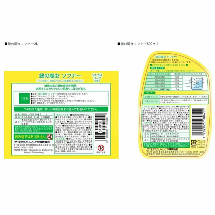 - サイズ:(緑の魔女ランドリー)5L&820mL、(緑の魔女ソフナー)2L&800mL