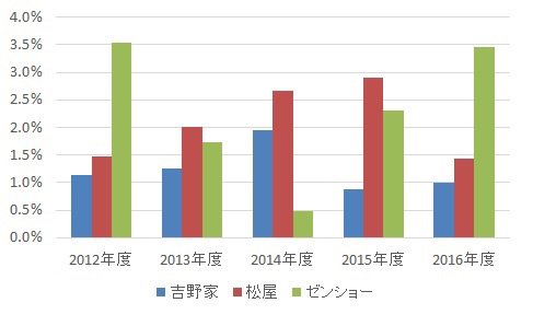 各社とも、営業利益が一桁台前半の水準です。営業利益率ベースで見ると、低採算で私たちが大好きな牛丼を提供してくれているということがわかります。