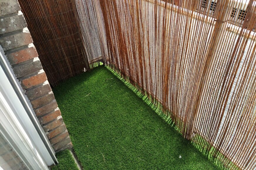 ベランダの印象を変えたいときは、床にウッドデッキやタイル、人工芝を敷いてみるのがオススメ。ホワイトのタイルは光を反射させるので、ベランダが明るい雰囲気になります。