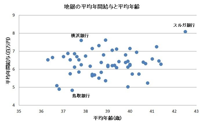 下図は、投信1編集部データ分析室が決算資料をもとに作成した各行の平均年齢と平均年収の分布です。ちなみに、横浜銀行、足利銀行のデータに関しては2016年3月期を、それ以外については2017年3月期の決算データ(いずれも単体)を使用しています。