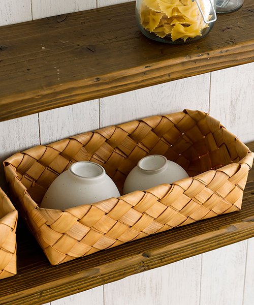 木の素材感が食器棚を開けた時にときめきを感じさせてくれる収納カゴです。お茶碗などの食器をカゴに入れておけばスッキリまとめられ、また、中に入ったものも確認しやすいのがポイント。取り出しやすいサイズ感で便利です。