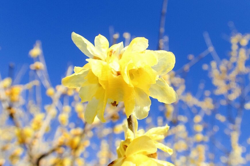 蝋細工のような透明感のある花がキュートな蝋梅(ロウバイ)。1~3月頃、梅の花に似た黄色の花を咲かせます。