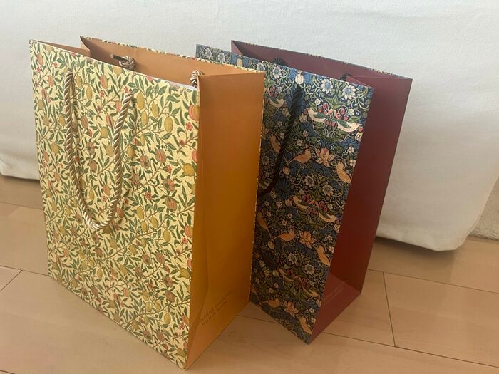 贈り物を渡すときや本などを貸すとき、むき出しのままなのは味気ないし、渡された側も持ち歩きがしづらくて大変ですよね。そんなときの手渡しバッグとしてぴったりなのが、ウィリアム・モリスのデザインが前後2面にあしらわれた、紙素材のハンドルバッグです。