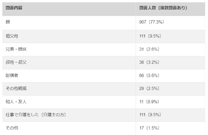 また、株式会社Speeeの同調査では、介護経験がある人の約8割が「両親の介護経験がある」と回答しています。