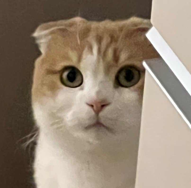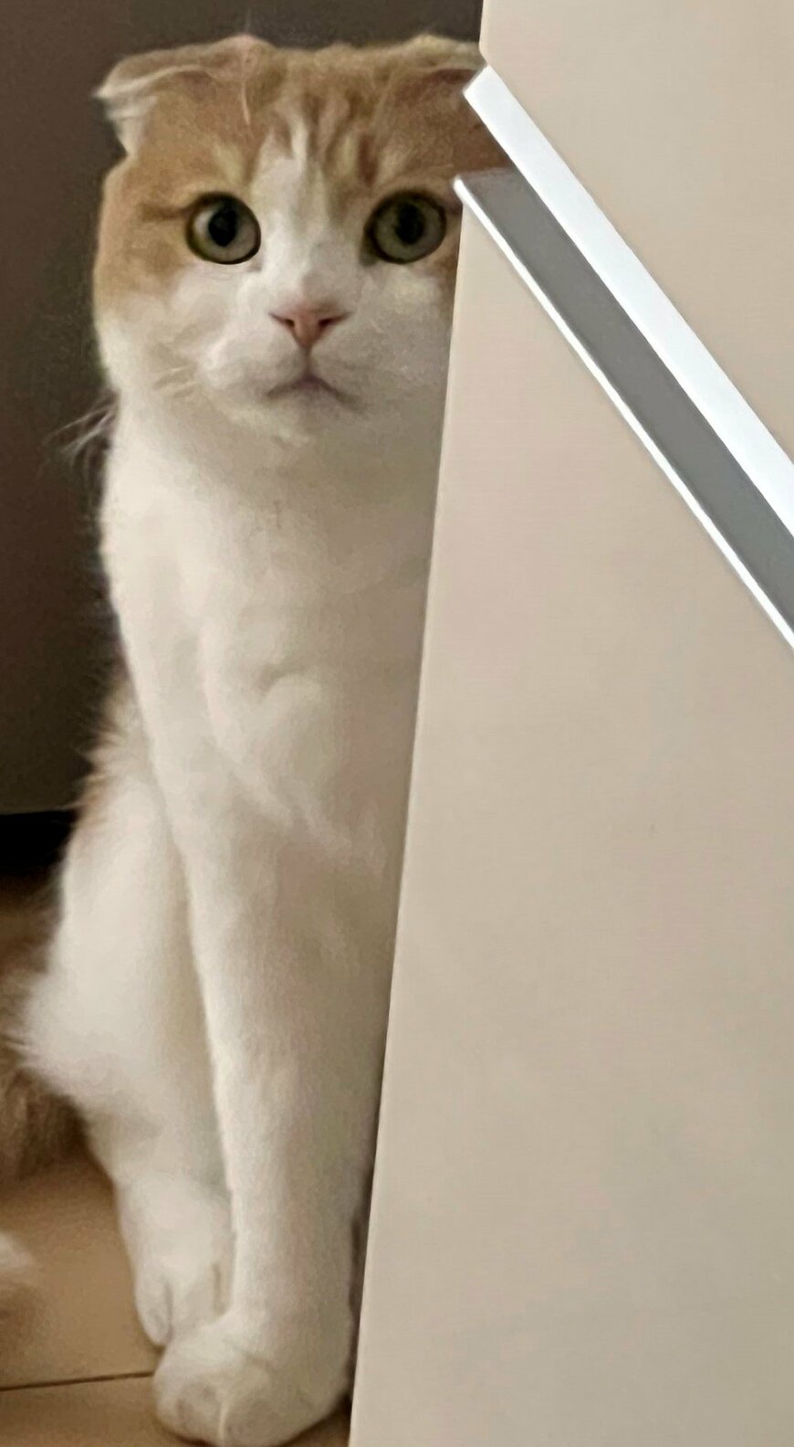 まん丸のおめめをパッと見開いた、目力のある表情が印象的です。物陰に身を潜める佇まいも相まって、とろくんの様子からはどこか圧が感じられます。「あれはきっと、僕が大好きなちゅ~るに違いない……」なんて気持ちで見ていたのでしょうか。