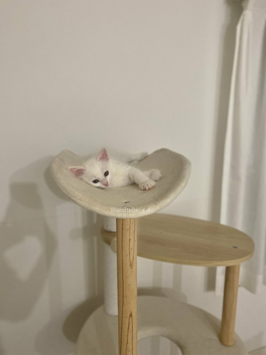 1枚目の写真には、子猫時代のマオくんの姿がありますね。キャットタワーの上で横たわる小さなマオくん。ちょこんとしたフォルムや、子猫らしさを感じるふわふわとした毛並みが印象的です。