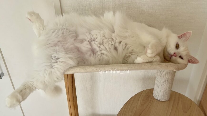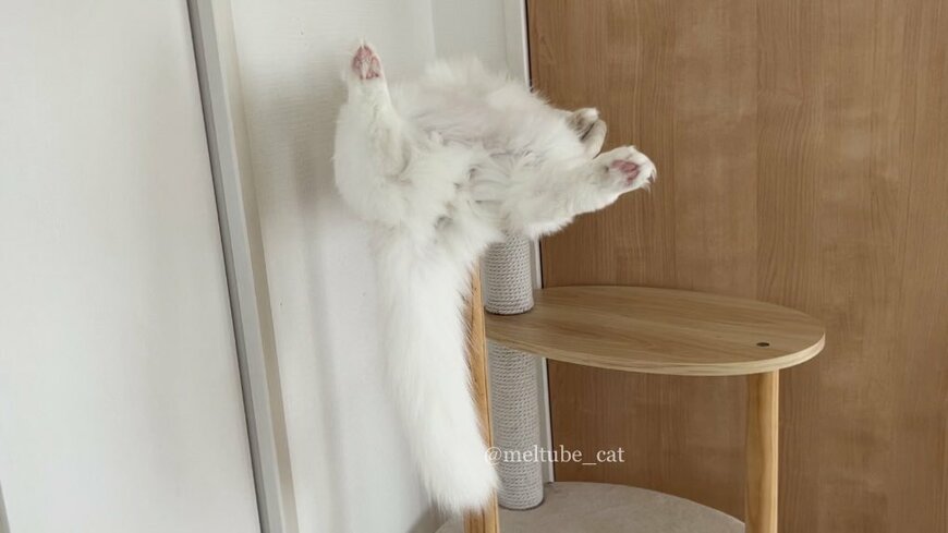 モフモフのお腹を惜しげもなく見せて横たわる姿に警戒心は感じられません。大きく広げた脚は、キャットタワーから溢れるかのようにはみ出ています……!