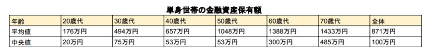 2022年の70歳代ひとり世帯の平均貯蓄額は1433万円です。また、中央値は485万円となっています。世代ごとの貯蓄額の平均と中央値は以下のとおりです。