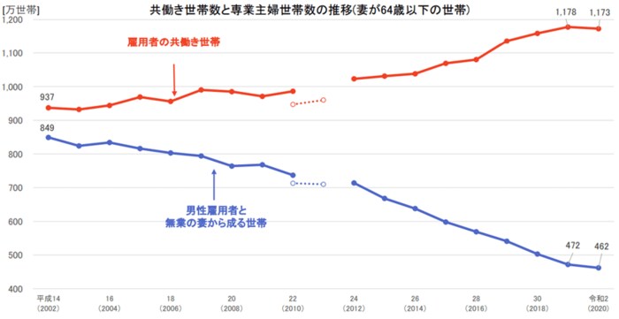 2020年において、共働き世帯は1173万世帯、専業主婦世帯は462万世帯で、共働き世帯は専業主婦世帯の約2.5倍ということがわかります。
