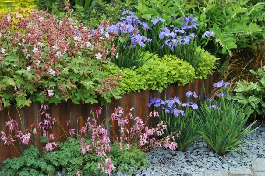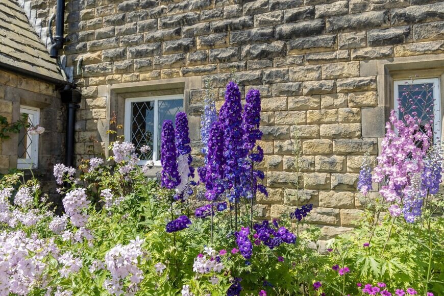 花色は同系色のグラデーションにするとまとまりやすくなります。黄色にブルーや紫といった反対色を差し色として植え込むと、コントラストが鮮やかになりオシャレです。