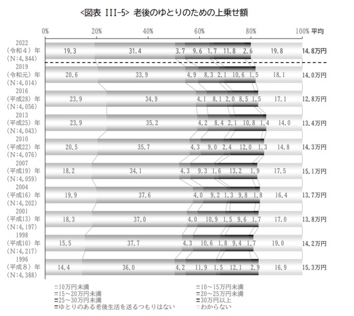 さらに生命保険文化センターの調査によると、ゆとりのある老後生活を送るために必要な上乗せ額は、平均で月14万8000円でした。
