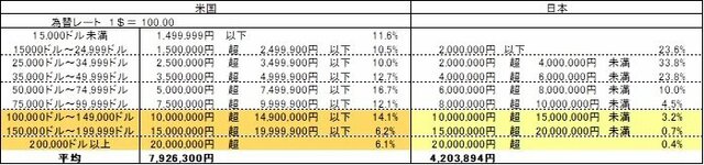 さて、このデータを見る限り、米国の方が「1000万円プレーヤー」の割合が多いのがお分かりになると思います。米国における年収1000万円以上の層は約26%となり、特に、米国の「2000万円プレーヤー」は家計全体の6.1%にもなります。それだけでも日本の「1000万円プレーヤー」の割合を凌駕しています。平均値を見ても、米国の家計平均収入は約800万円となっており、日本の給与所得者平均(約420万円)の2倍近くになっています。