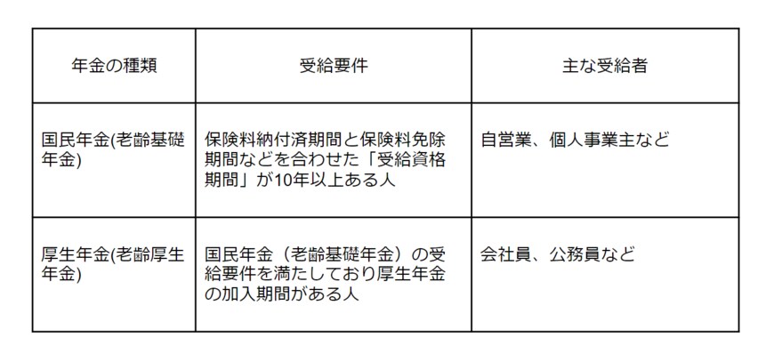 国民年金は、保険料を支払った期間や免除を受けた期間などを合わせた期間が10年以上あることが受給要件で、厚生年金はこの条件プラス厚生年金に加入していたことがある人が受給できます。