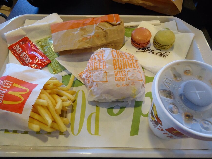 この時は普通にチーズバーガーとポテトを頼んでいますが、併設のマックカフェでフランスの代表的なお菓子・マカロンを注文。当時はフランボワーズ、ピスタチオ、レモン、チョコレートなどのいろいろな種類が販売されていました。