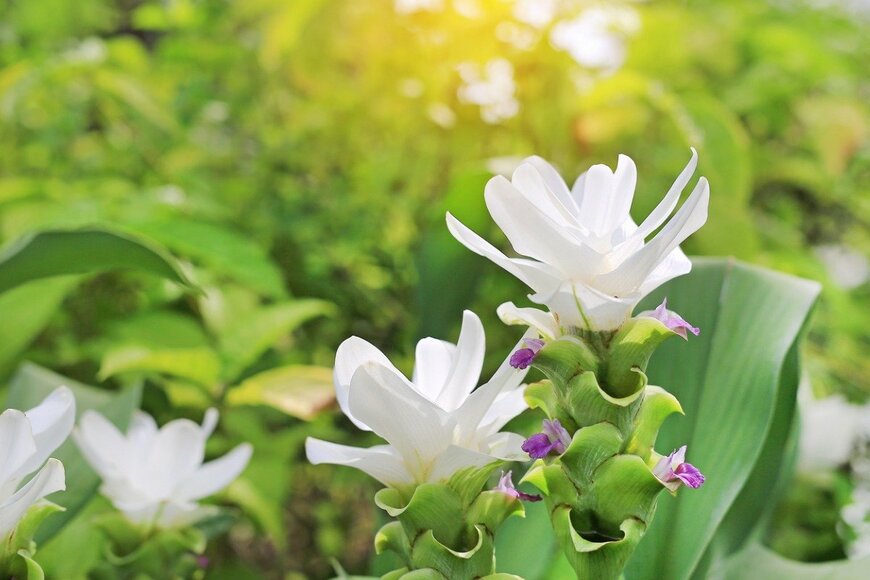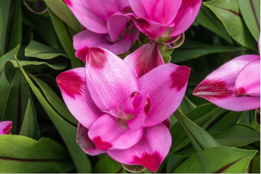 注目のクルクマは切り花でも人気の多年草。ピンクやホワイト、レッドの苞が幾重にも重なった姿が、まるで花のようで特徴的です。
