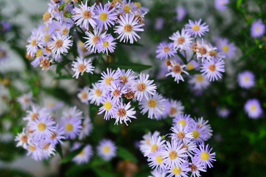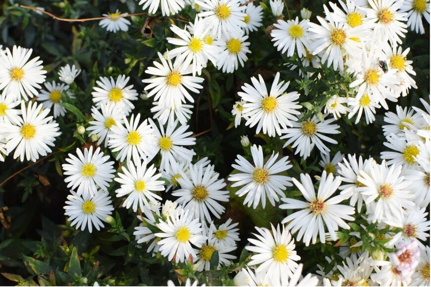 ホワイトやピンク、ブルーの野趣あふれる花を咲かせる宿根アスター。マーガレットに似た一重咲きが定番ですが豪華な花が咲く八重咲きや矮性種、高性種などさまざまなタイプが出回っています。