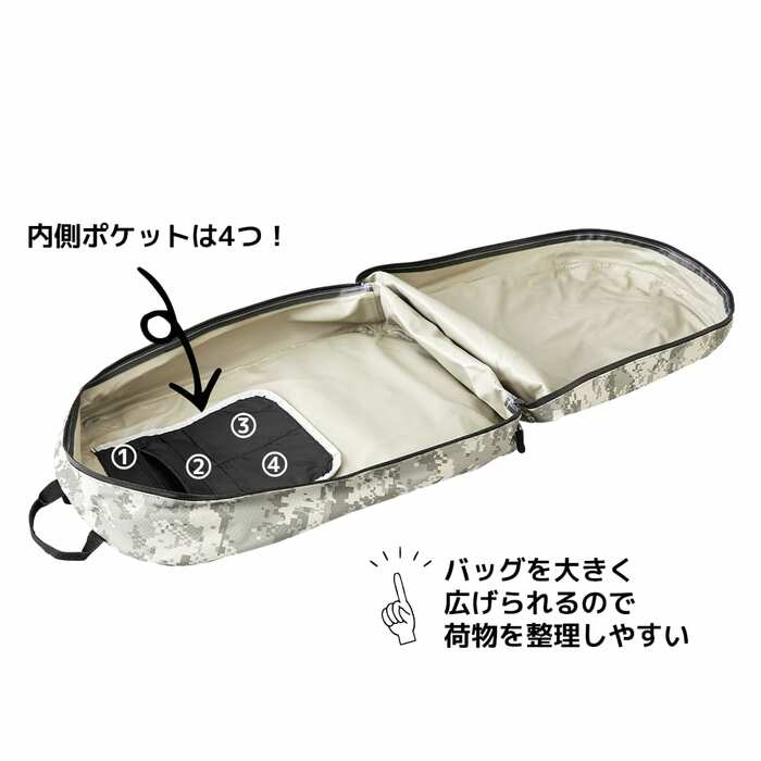 底部からコの字型にファスナーがついているので、平らに置くと大きく広げられます。内側には4つのポケットがあり、小物の整理に便利です。肩ベルトや腰部分にクッションが入っているので背負う負担が軽減されます。