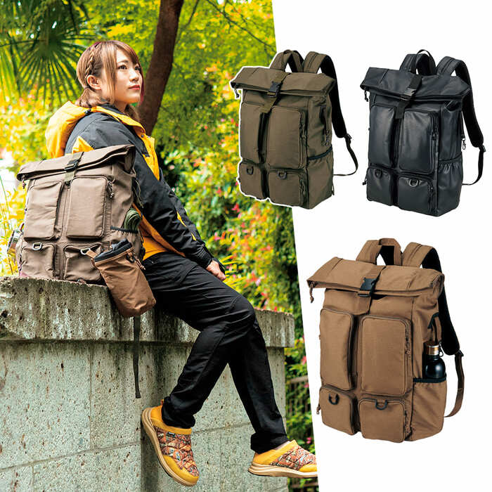 シリーズ品で別売りの「ジョイントサコッシュ」を装着できるバックパックです。開口部にはロール式の留め具に加えてL字型のファスナーを採用しているので、出し入れの頻度に合わせて使い分けることも可能です。外側には大小2種類×2つずつのポケットがあるので、さまざまな物を整理したい方はぜひご検討ください。