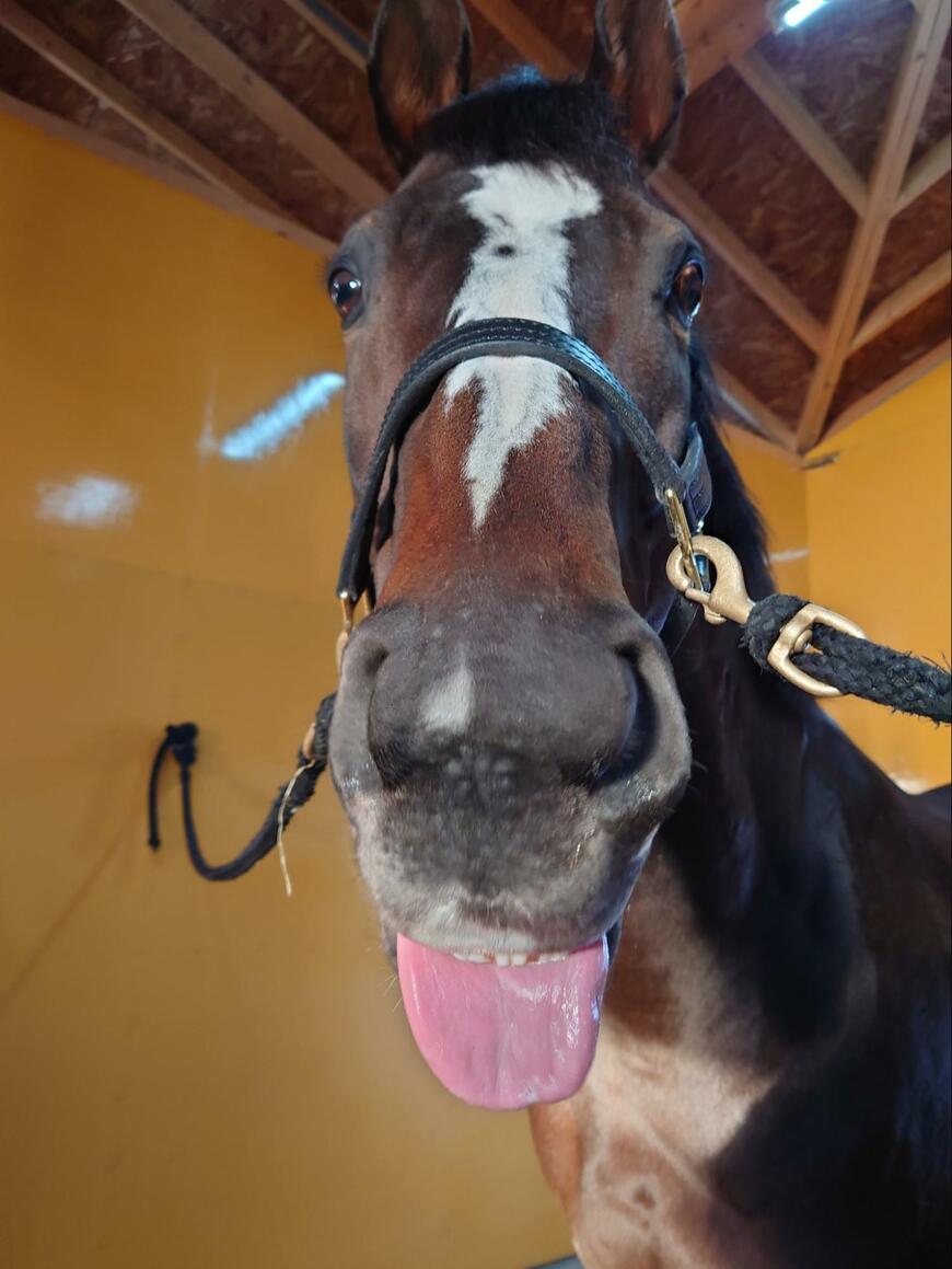 舌出しを挟みながら、カメラ目線で白湯を飲むオジュウ🐴