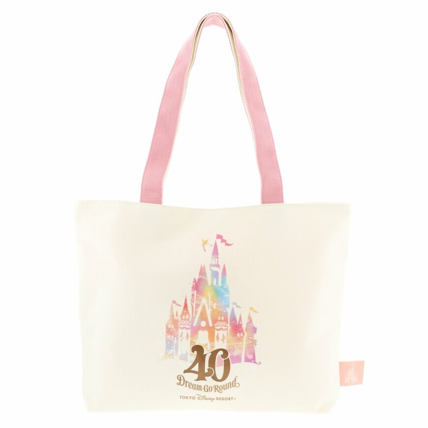 40周年のロゴとシンデレラ城が目を引くトートバッグ。内側と持ち手のかわいいピンクカラーがポイントです。高さ約30cm、幅約40cm、マチ約6cmあるので、パークで買ったお土産などもたくさん入りそうです。
