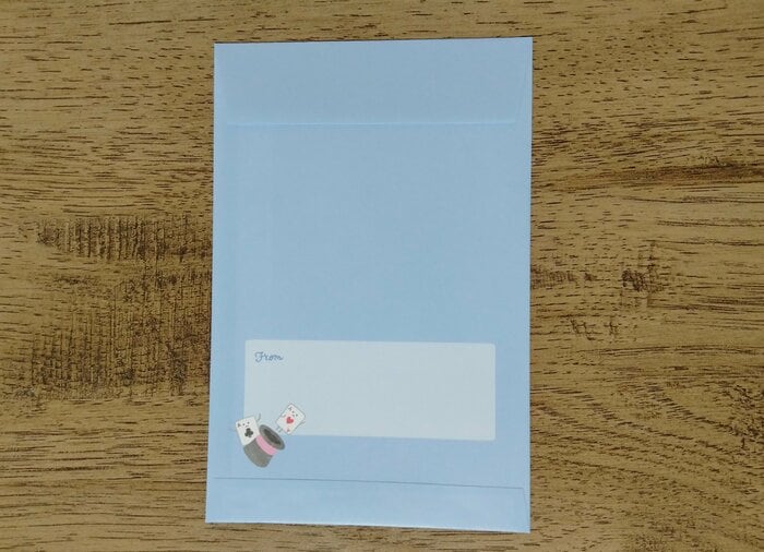 封筒の裏面には、帽子から飛び出すトランプが描かれています。
